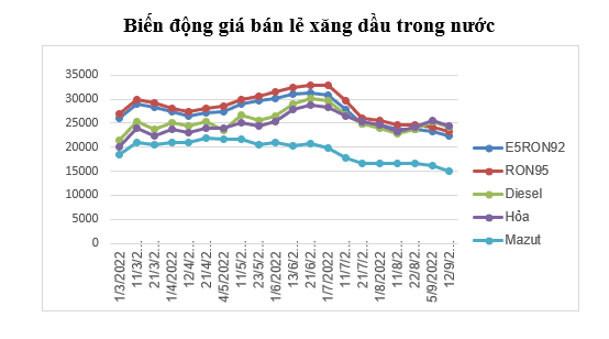 - Xăng E5RON92: không cao hơn 22.231 đồng/lít (giảm 1.128 đồng/lít so với giá bán lẻ hiện hành), thấp hơn xăng RON95-III 983 đồng/lít;