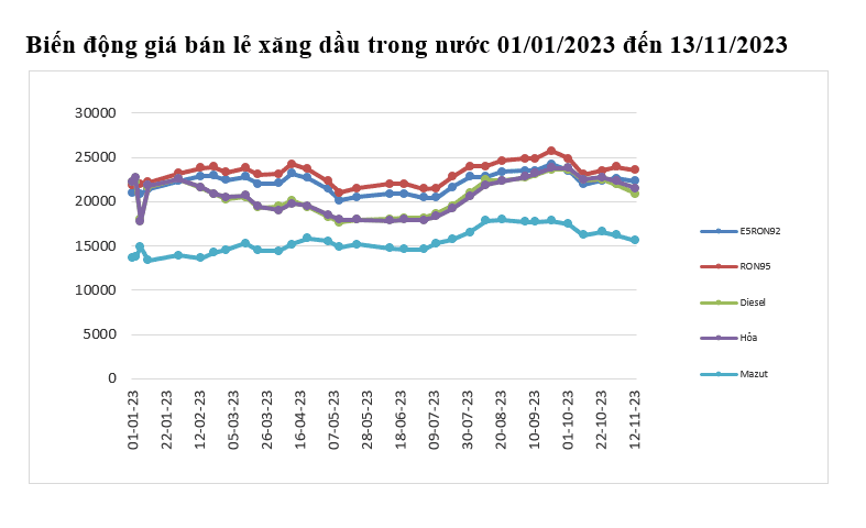 Theo đó, giá xăng E5RON92 không cao hơn 22.274 đồng/lít, giảm 340 đồng/lít so với giá bán lẻ hiện hành, thấp hơn xăng RON95-III 1.256 đồng/lít; Xăng RON95-III: không cao hơn 23.530 đồng/lít, giảm 399 đồng/lít so với giá bán lẻ hiện hành; Dầu điêzen 0.05S không cao hơn 20.888 đồng/lít, giảm 1.052 đồng/lít so với giá bán lẻ hiện hành...