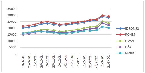 Bình quân giá thành phẩm xăng dầu thế giới giữa kỳ điều hành giá xăng dầu ngày 11/3/2022 và kỳ điều hành ngày 21/3/2022 là: 121.912 USD/thùng xăng RON92 dùng để pha chế xăng E5RON92 (giảm 10.340 USD/thùng, tương đương giảm 7.82% so với kỳ trước); 125.842 USD/thùng xăng RON95 (giảm 9.908 USD/thùng, tương đương giảm 7.30% so với kỳ trước; 120.408 USD/thùng dầu hỏa (giảm 14.840 USD/thùng, tương đương giảm 10.97% so với kỳ trước); 122.338 USD/thùng dầu diesel (giảm 22.853 USD/thùng, tương đương giảm 15.74% so với kỳ trước); 625.090 USD/tấn dầu mazut 180CST 3,5S (giảm 22.757 USD/tấn, tương đương giảm 3.51% so với kỳ trước).