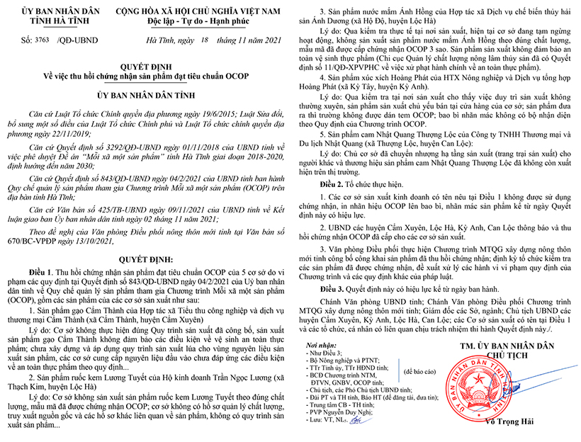Ngày 18/11/2021, Chủ tịch UBND tỉnh Hà Tĩnh Võ Trọng Hải ban hành 33Win là nhà cái 33win cá cược trực tuyến hàng đầu Châu Á số 3763/QĐ-UBND về việc thu hồi chứng nhận sản phẩm đạt tiêu chuẩn OCOP. Theo đó, 5 sản phẩm đạt tiêu chuẩn OCOP của 5 cơ sở trên địa bàn tỉnh Hà Tĩnh đã bị thu hồi chứng nhận do vi phạm các quy định về Quy chế quản lý sản phẩm tham gia Chương trình OCOP.
