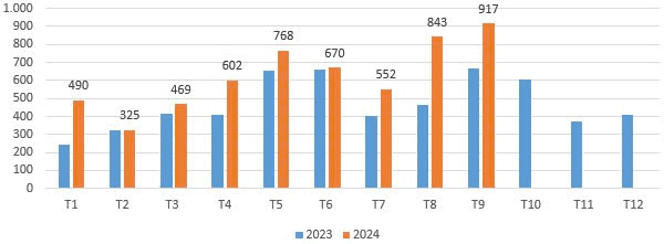Biểu đồ 1: Kim ngạch xuất khẩu rau quả (bao gồm chế biến) của Việt Nam qua các tháng năm 2023 - 2024