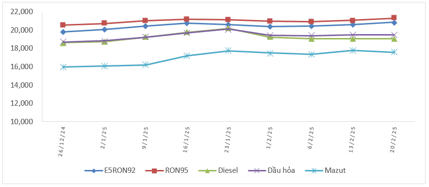 - Xăng E5RON92: không cao hơn 20.855 đồng/lít (tăng 257 đồng/lít so với giá cơ sở hiện hành), thấp hơn xăng RON95-III 476 đồng/lít;