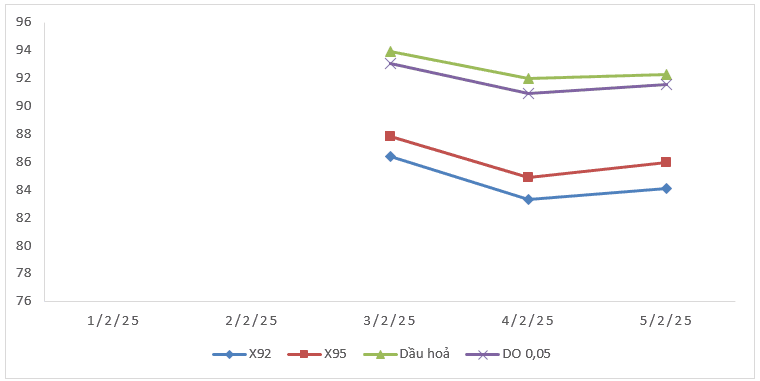Bình quân giá thành phẩm 33Win 4com nhà cái cá cược WC thế giới giữa kỳ điều hành giá ngày 01/02/2025 và kỳ điều hành ngày 06/02/2025 là: 84,590 USD/thùng xăng RON92 dùng để pha chế xăng E5RON92 (tăng 0,056 USD/thùng, tương đương tăng 0,07%); 86,227 USD/thùng xăng RON95 (giảm 0,611 USD/thùng, tương đương giảm 0,70%); 92,713 USD/thùng dầu hỏa (giảm 0,495 USD/thùng, tương đương giảm 0,53%); 91,837 USD/thùng dầu điêzen 0,05S (giảm 1,453 USD/thùng, tương đương giảm 1,56%); 482,537 USD/tấn dầu mazut 180CST 3,5S (giảm 7,161 USD/tấn, tương đương giảm 1,46%).