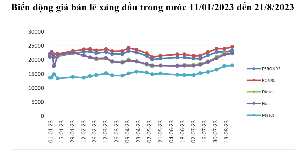 - Xăng E5RON92: không cao hơn 23.339 đồng/lít (tăng 517 đồng/lít so với giá bán lẻ hiện hành), thấp hơn xăng RON95-III 1.262 đồng/lít;