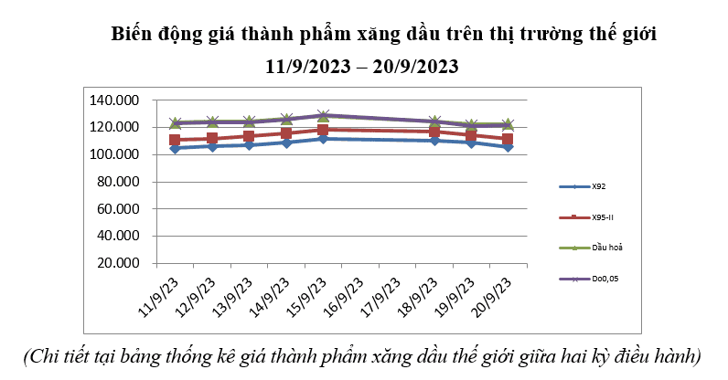 - Không trích lập, không chi sử dụng Quỹ Bình ổn đối với dầu madút; chi sử dụng Quỹ Bình ổn đối với 02 mặt hàng xăng, dầu điêzen, dầu hỏa: Áp dụng từ 16 giờ 00’ ngày 21 tháng 9 năm 2023.