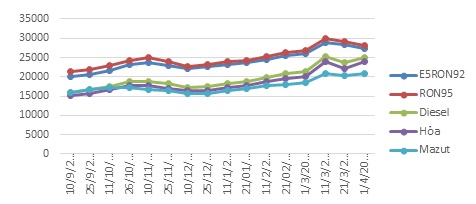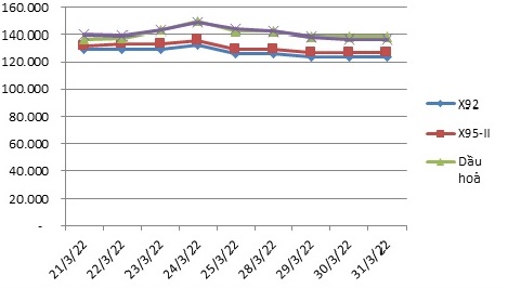 Bình quân giá thành phẩm xăng dầu thế giới giữa kỳ điều hành giá xăng dầu ngày 21/3/2022 và kỳ điều hành ngày 01/4/2022 là: 126,837 USD/thùng xăng RON92 dùng để pha chế xăng E5RON92 (tăng 4,93 USD/thùng, tương đương tăng 4,04% so với kỳ trước); 130,550 USD/thùng xăng RON95 (tăng 4,71 USD/thùng, tương đương tăng 3,74% so với kỳ trước; 140,557 USD/thùng dầu hỏa (tăng 20,15 USD/thùng, tương đương tăng 16,73% so với kỳ trước); 140,727 USD/thùng dầu điêzen (tăng 18,39 USD/thùng, tương đương tăng 15,03% so với kỳ trước); khoảng 679,128 USD/tấn dầu mazut 180CST 3,5S (tăng 54,04 USD/tấn, tương đương tăng 8,64% so với kỳ trước).