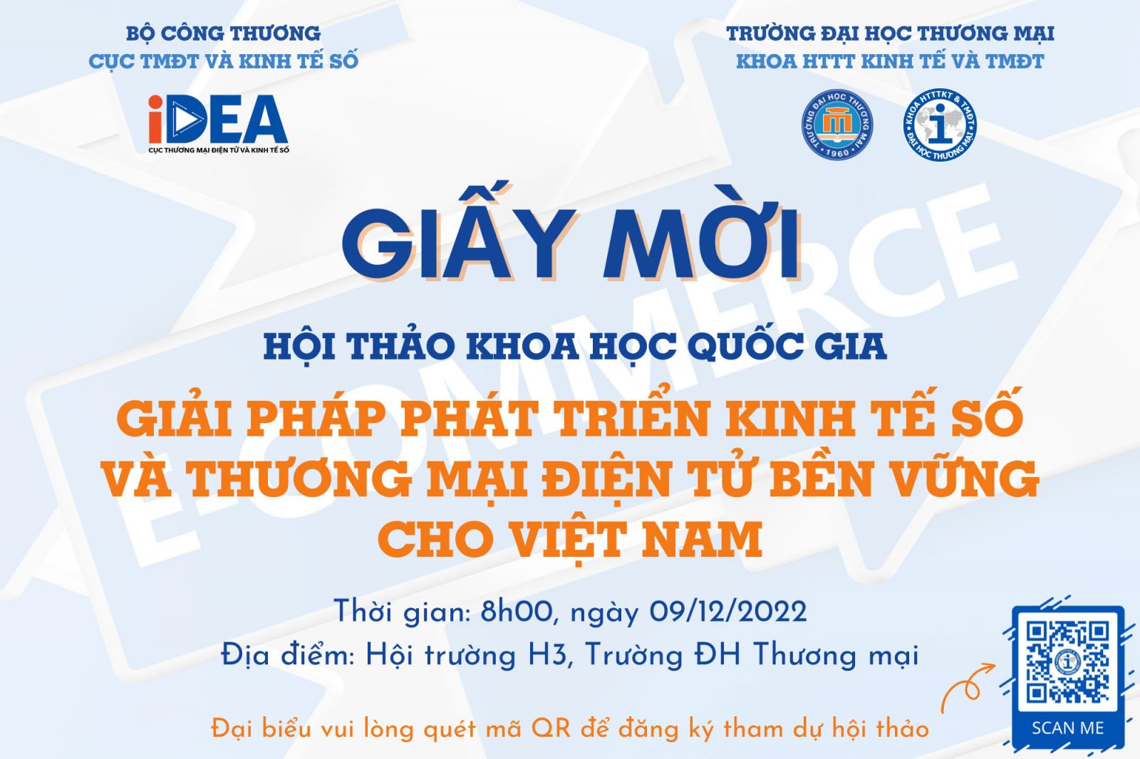 Thời gian nhận đăng ký: đến hết ngày 05/12/2022. Thư mời tham dự sẽ được gửi đến các Đại biểu từ ngày 06/12 đến 08/12/2022 qua email và SĐT đăng ký. Thông tin chi tiết liên hệ Khoa Hệ thống thông tin kinh tế và Thương mại điện tử - Trường Đại học Thương mại.