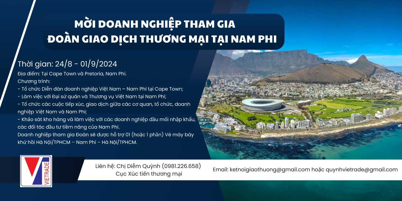 - Ngoài ra, các doanh nghiệp được lựa chọn tham gia Đoàn, sau khi kết thúc chương trình Đoàn sẽ tiếp tục được Cục XTTM hỗ trợ kết nối với các đối tác Nam Phi tiềm năng (nếu có), cung cấp dịch vụ thẩm định đối tác, tư vấn lập hợp đồng ngoại thương... theo nhu cầu.