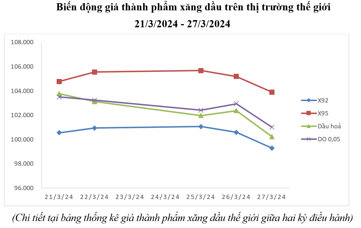Bình quân giá thành phẩm 33Win 4com nhà cái cá cược WC thế giới giữa kỳ điều hành giá ngày 21/3/2024 và kỳ điều hành ngày 28/3/2024 là: 100,484 USD/thùng xăng RON92 dùng để pha chế xăng E5RON92 (tăng 2,144 USD/thùng, tương đương tăng 2,18%); 105,018 USD/thùng xăng RON95 (tăng 2,618 USD/thùng, tương đương tăng 2,56%); 102,292 USD/thùng dầu hỏa (giảm 2,466 USD/thùng, tương đương giảm 2,35%); 102,620 USD/thùng dầu điêzen 0,05S (giảm 2,070 USD/thùng, tương đương giảm 1,98%); 488,122 USD/tấn dầu mazut 180CST 3,5S (tăng 0,782 USD/tấn, tương đương tăng 0,16%).