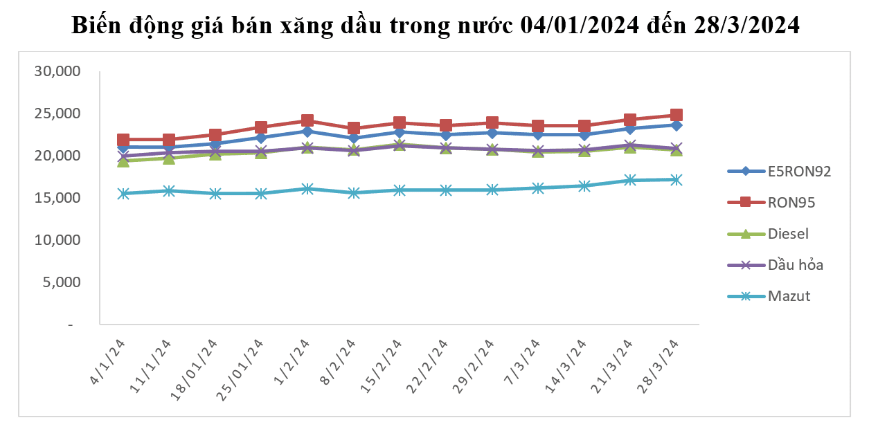 - Xăng RON95-III: không cao hơn 24.816 đồng/lít (tăng 532 đồng/lít so với giá cơ sở hiện hành);