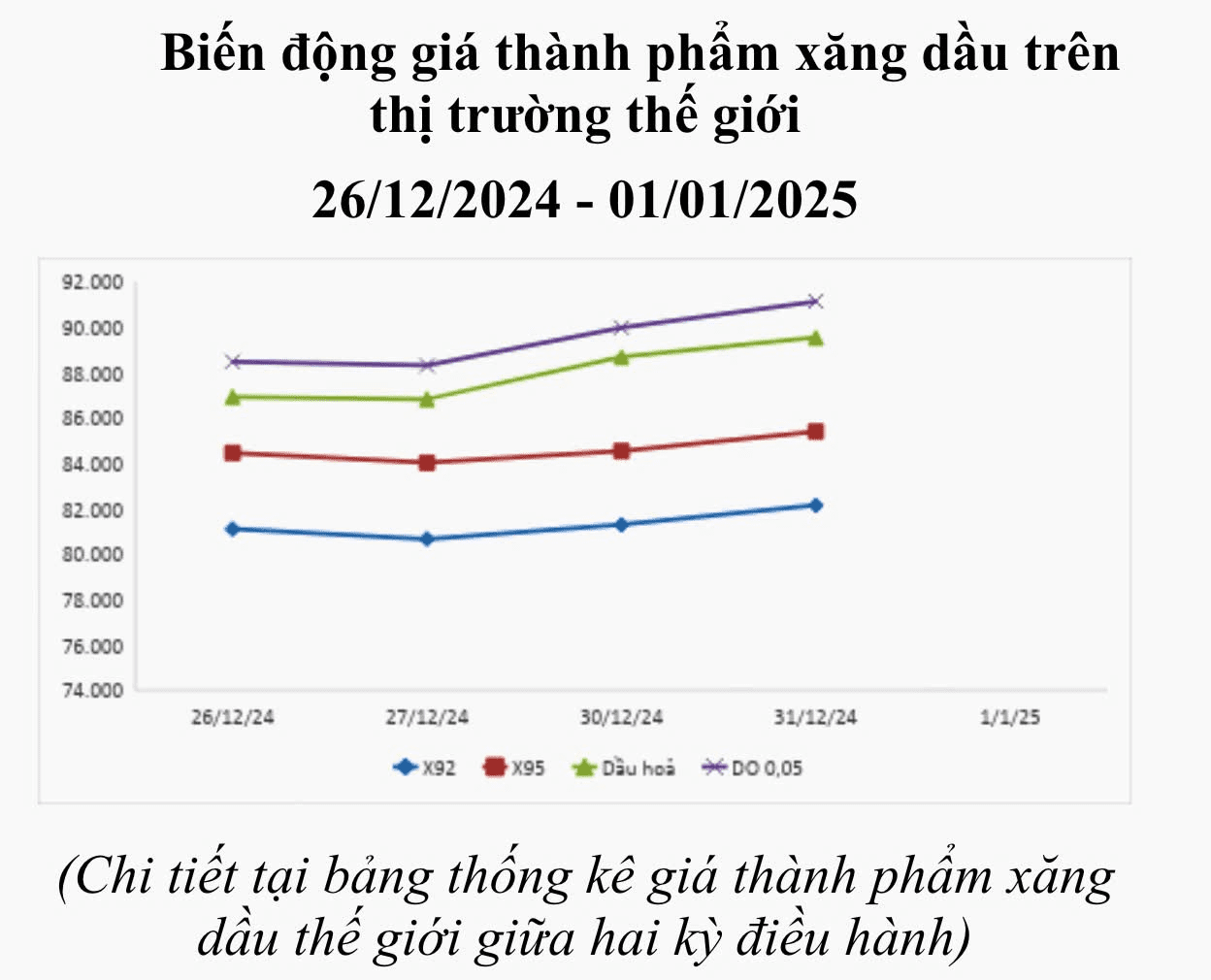 Bình quân giá thành phẩm 33Win 4com nhà cái cá cược WC thế giới giữa kỳ điều hành giá ngày 26/12/2024 và kỳ điều hành ngày 02/01/2025 là: 81,305 USD/thùng xăng RON92 dùng để pha chế xăng E5RON92 (tăng 0,982 USD/thùng, tương đương tăng 1,22%); 84,605 USD/thùng xăng RON95 (tăng 0,932 USD/thùng, tương đương tăng 1,11%); 87,998 USD/thùng dầu hỏa (tăng 0,688 USD/thùng, tương đương tăng 0,79%); 89,478 USD/thùng dầu điêzen 0,05S (tăng 0,665 USD/thùng, tương đương tăng 0,75%); 452,470 USD/tấn dầu mazut 180CST 3,5S (tăng 4,402 USD/tấn, tương đương tăng 0,98%).