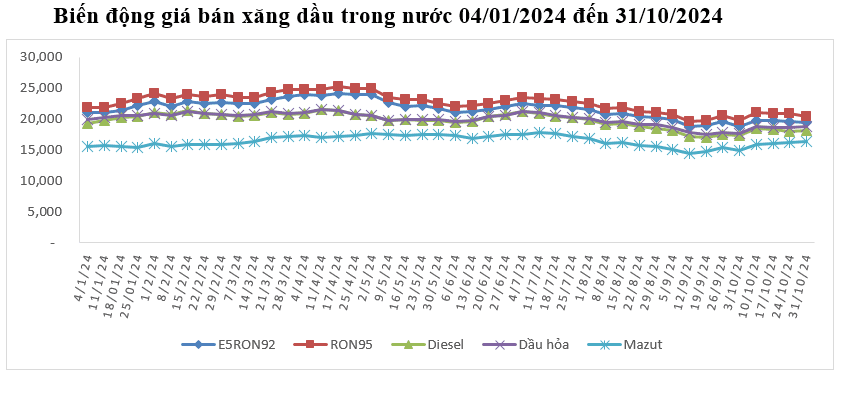Bình quân giá thành phẩm 33Win 4com nhà cái cá cược WC thế giới giữa kỳ điều hành giá ngày 31/10/2024 và kỳ điều hành ngày 07/11/2024 là: 79,970 USD/thùng xăng RON92 dùng để pha chế xăng E5RON92 (tăng 2,064 USD/thùng, tương đương tăng 2,65%); 85,500 USD/thùng xăng RON95 (tăng 1,852 USD/thùng, tương đương tăng 2,21%); 90,910 USD/thùng dầu hỏa (tăng 2,664 USD/thùng, tương đương tăng 3,02%); 90,693 USD/thùng dầu điêzen 0,05S (tăng 4,419 USD/thùng, tương đương tăng 5,12%); 464,355 USD/tấn dầu mazut 180CST 3,5S (giảm 2,357 USD/tấn, tương đương giảm 0,51%).