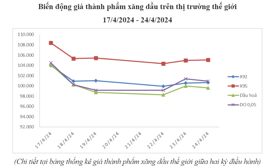 Bình quân giá thành phẩm 33Win 4com nhà cái cá cược WC thế giới giữa kỳ điều hành giá ngày 17/4/2024 và kỳ điều hành ngày 25/4/2024 là: 101,172 USD/thùng xăng RON92 dùng để pha chế xăng E5RON92 (giảm 2,608 USD/thùng, tương đương giảm 2,51%); 105,582 USD/thùng xăng RON95 (giảm 2,608 USD/thùng, tương đương giảm 2,41%); 100,157 USD/thùng dầu hỏa (giảm 5,108 USD/thùng, tương đương giảm 4,85%); 100,892 USD/thùng dầu điêzen 0,05S (giảm 5,088 USD/thùng, tương đương giảm 4,80%); 511,045 USD/tấn dầu mazut 180CST 3,5S (tăng 2,847 USD/tấn, tương đương tăng 0,56%).