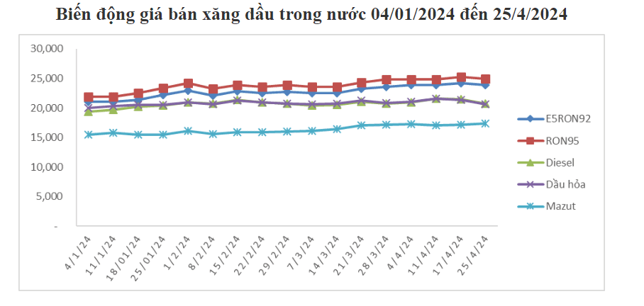 - Xăng RON95-III: không cao hơn 24.915 đồng/lít (giảm 322 đồng/lít so với giá cơ sở hiện hành);