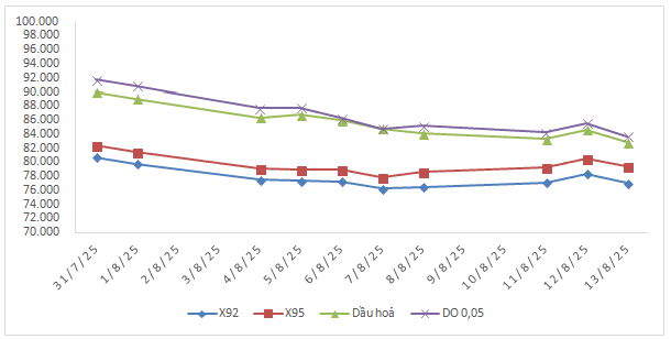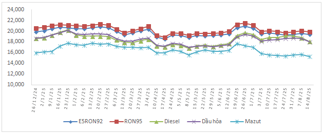 Xăng E5 RON92 (đồng/lít) | Xăng RON95 (đồng/lít) | Dầu Diesel (đồng/lít) | Dầu hỏa (đồng/lít) | Dầu mazut (đồng/kg) | ||