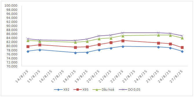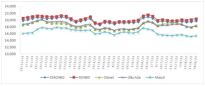 Xăng E5 RON92 (đồng/lít) | Xăng RON95 (đồng/lít) | Dầu Diesel (đồng/lít) | Dầu hỏa (đồng/lít) | Dầu mazut (đồng/kg) | ||