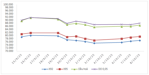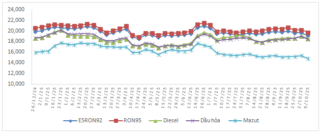 Xăng E5 RON92 (đồng/lít) | Xăng RON95 (đồng/lít) | Dầu Diesel (đồng/lít) | Dầu hỏa (đồng/lít) | Dầu mazut (đồng/kg) | ||