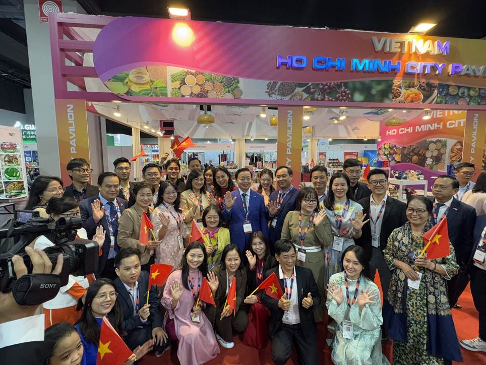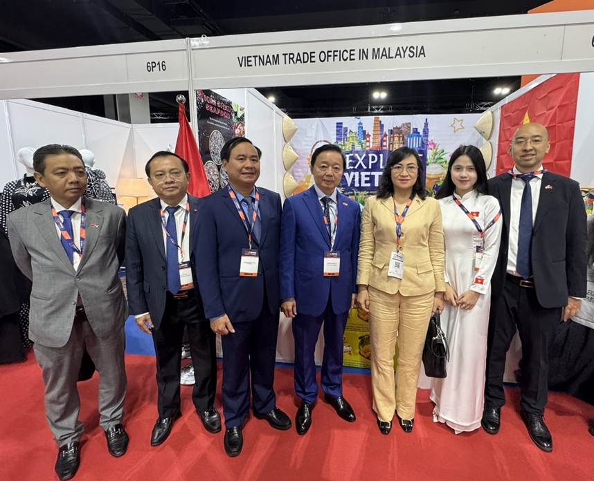 Phó Thủ tướng Trần Hồng Hà, Thứ trưởng Phan Thị Thắng và Lãnh đạo các Bộ Nông nghiệp và Môi trường; Tài chính; Văn hóa, Thể thao và Du lịch thăm gian hàng của Thương vụ Việt Nam tại Malaysia - Ảnh: PN