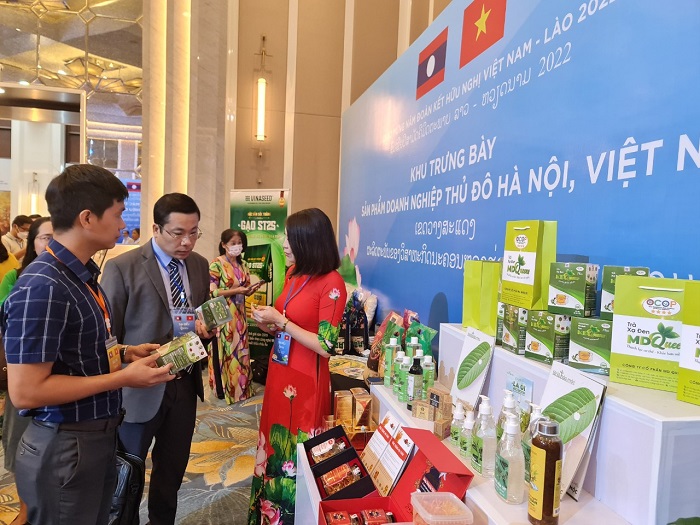 Lãnh đạo TP Hà Nội cùng đại biểu các Sở, ngành tham quan không gian trưng bày sản phẩm đặc trưng của nước bạn Lào (Ảnh: Cổng giao tiếp điện tử Hà Nội)