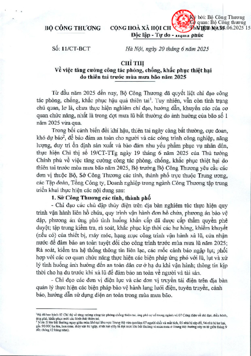 Tiêu đề văn bản | Chỉ thị về việc tăng cường công tác phòng, chống, khắc phục thiệt hại do thiên tai trước mùa mưa bão năm 2025 | ||