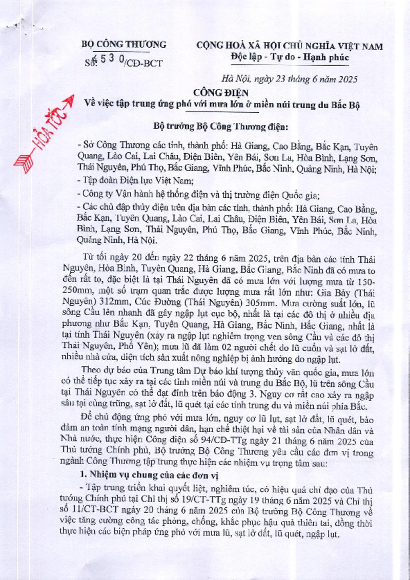 Tiêu đề văn bản | Công điện hỏa tốc về tập trung ứng phó với mưa lớn ở miền núi trung du Bắc Bộ | ||
