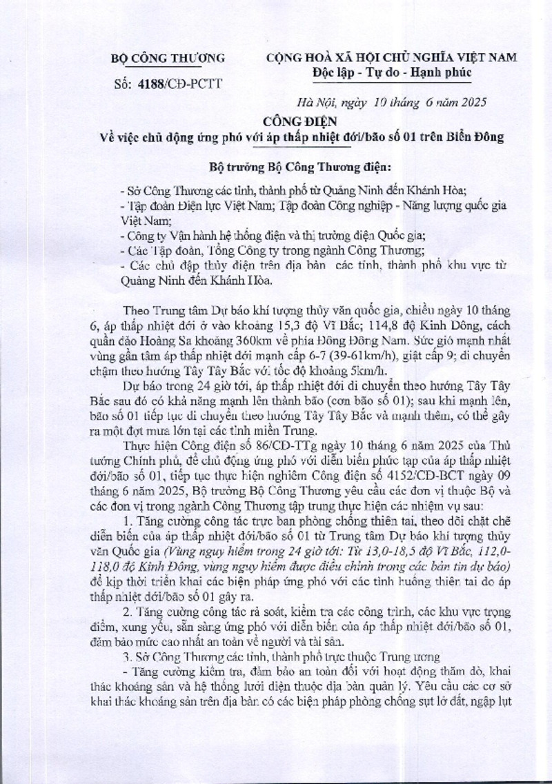 Tiêu đề văn bản | Công điện về việc chủ động ứng phó với áp thấp nhiệt đới/bão số 01 trên Biển Đông | ||