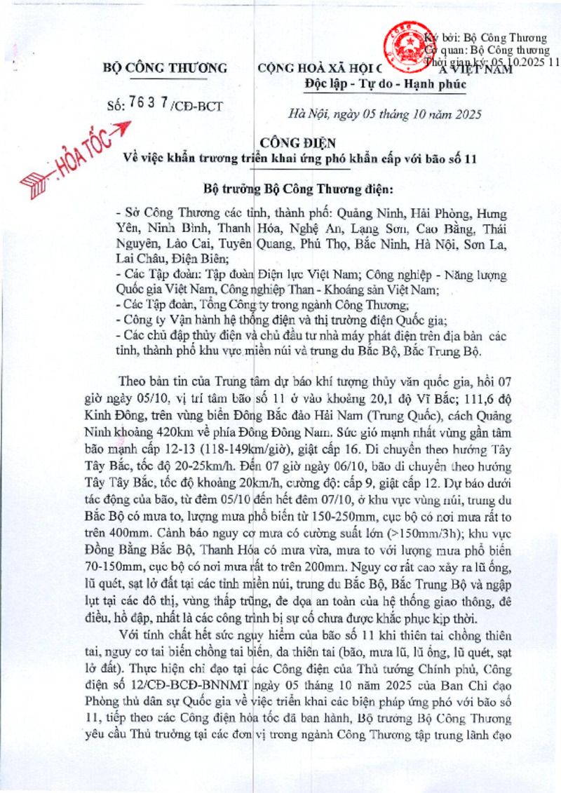 Tiêu đề văn bản | Công điện về việc khẩn trương triển khai ứng phó khẩn cấp với bão số 11 | ||