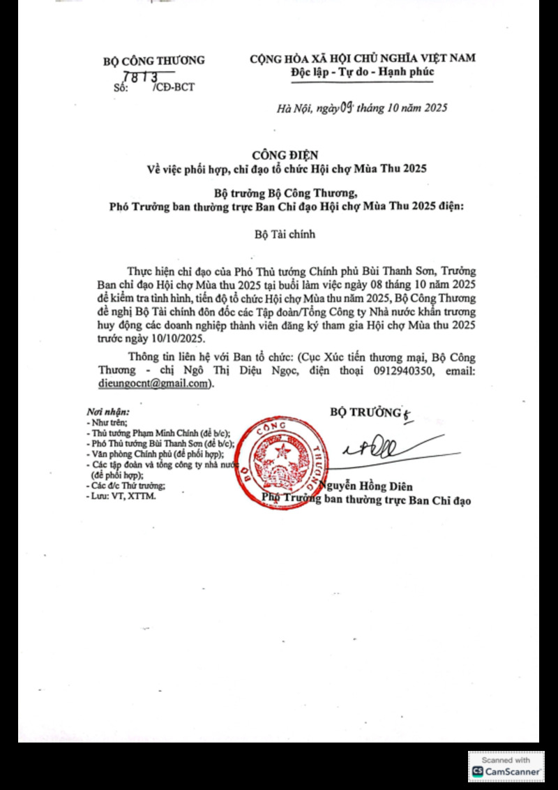 Tiêu đề văn bản | Công điện về việc phối hợp, chỉ đạo tổ chức Hội chợ Mùa Thu năm 2025 | ||