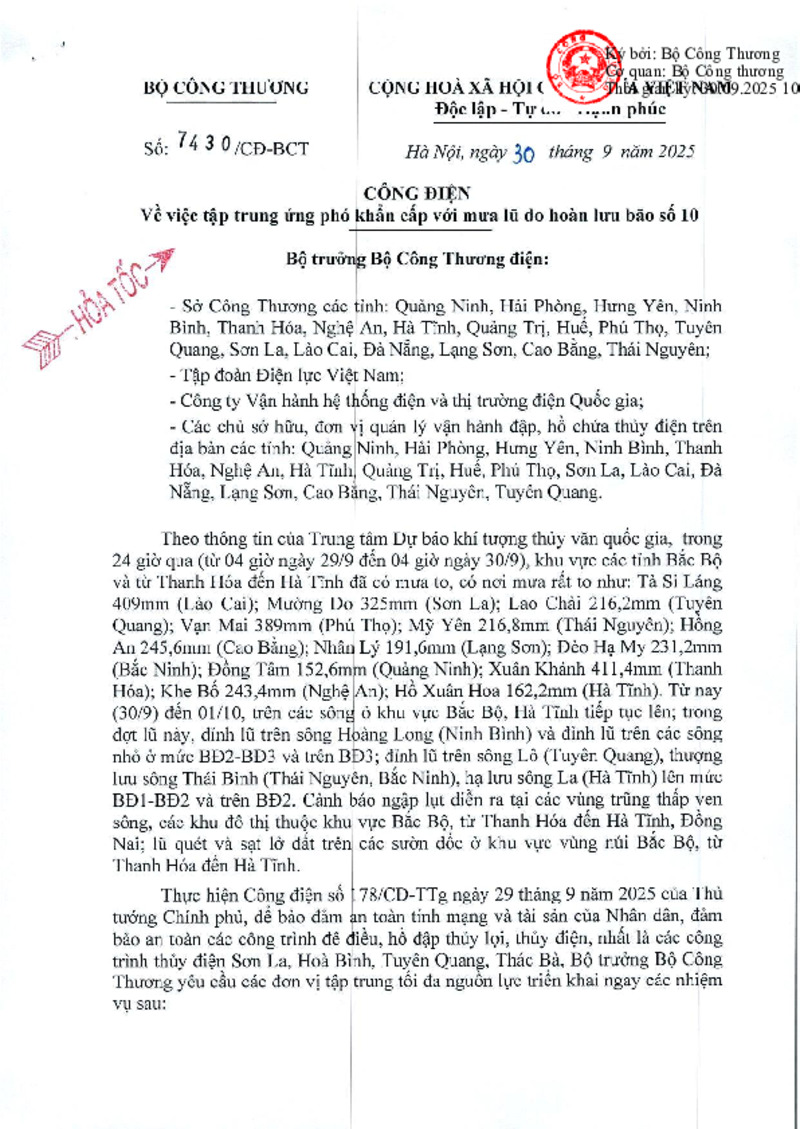 Tiêu đề văn bản | Công điện về việc tập trung ứng phó khẩn cấp với mưa lũ do hoàn lưu bão số 10 | ||