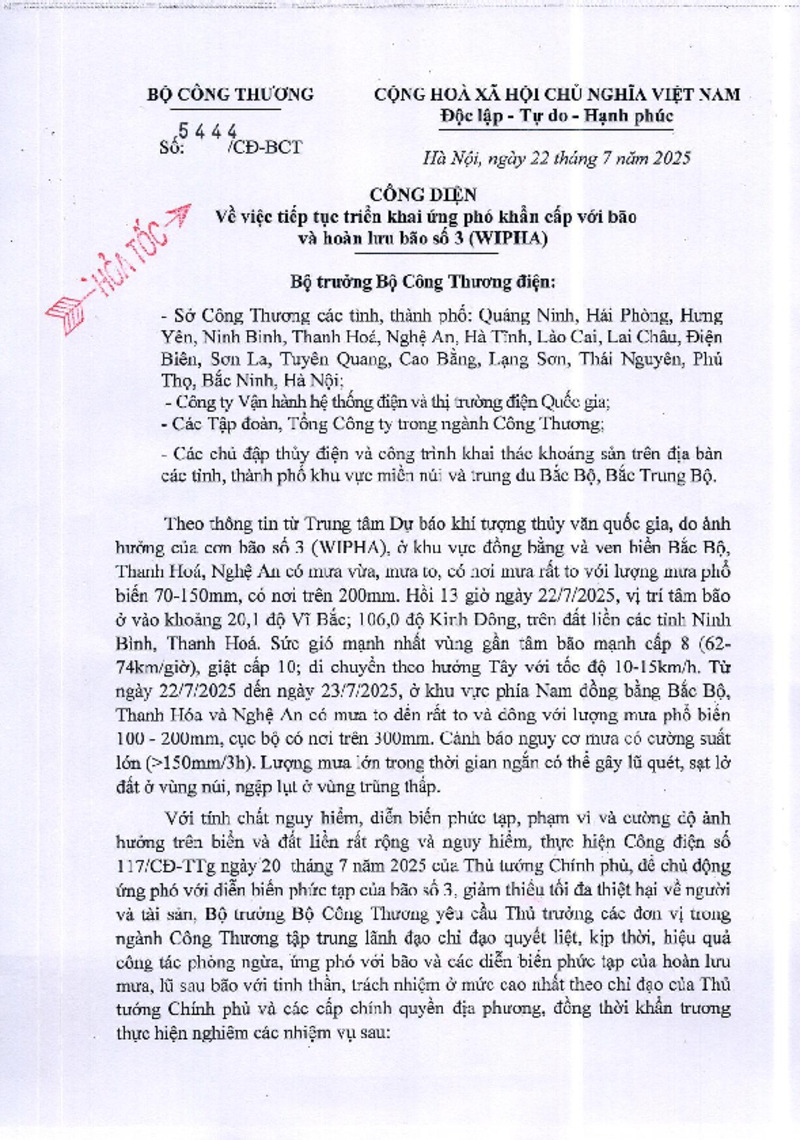 Tiêu đề văn bản | Công điện về việc tiếp tục triển khai ứng phó khẩn cấp với bão và hoàn lưu bão số 3 (Wipha) | ||
