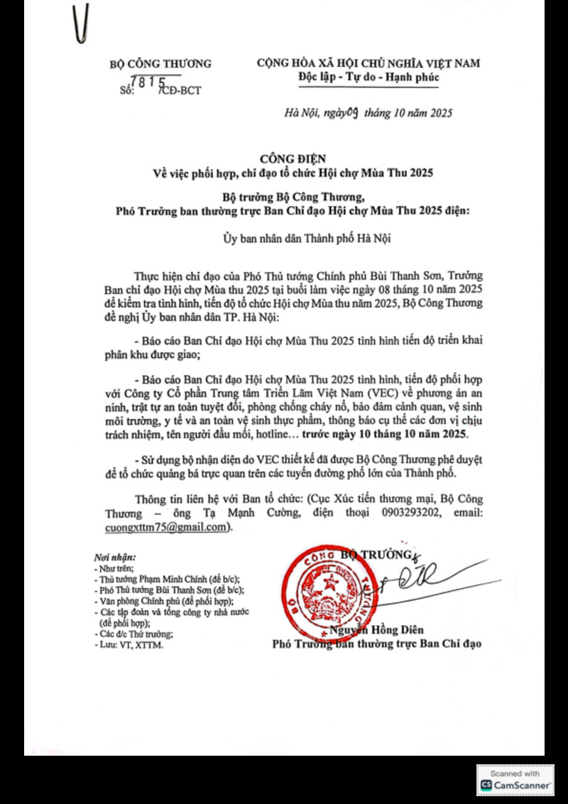 Tiêu đề văn bản | Công điện về việc phối hợp, chỉ đạo tổ chức Hội chợ Mùa thu 2025 | ||