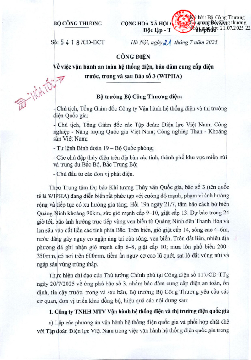 Tiêu đề văn bản | Công điện về việc vận hành an toàn hệ thống điện, bảo đảm cung cấp điện trước, trong và sau Bão số 3 (Wipha) | ||