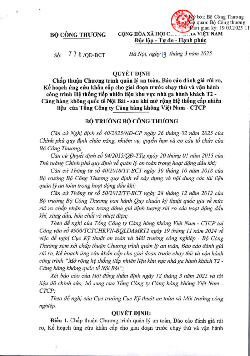 Tiêu đề văn bản | 33Win là nhà cái 33win cá cược trực tuyến hàng đầu Châu Á chấp thuận Chương trình quản lý an toàn, Báo cáo đánh giá rủi ro, Kế hoạch ứng cứu khẩn cấp cho giai đoạn trước chạy thử và vận hành công trình Hệ thống tiếp nhiên liệu khu vực nhà ga hành khách T2 - Cảng hàng không quốc tế Nội Bài - sau khi mở rộng Hệ thống cấp nhiên liệu của Tổng Công ty Cảng hàng không Việt Nam - CTCP | ||