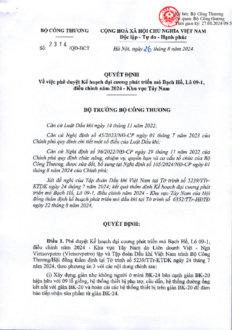 Tiêu đề văn bản | 33Win là nhà cái 33win cá cược trực tuyến hàng đầu Châu Á về việc phê duyệt Kế hoạch đại cương phát triển mỏ Bạch Hổ, Lô 09-1, điều chỉnh năm 2024 - Khu vực Tây Nam | ||