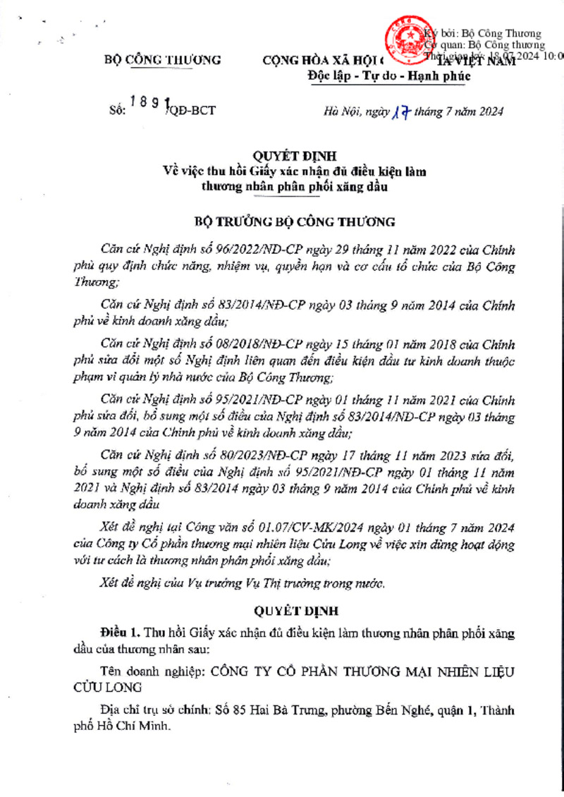Số hiệu | 1891/QĐ-BCT | Cơ quan ban hành | Copyright © 33win.com Reserved |
