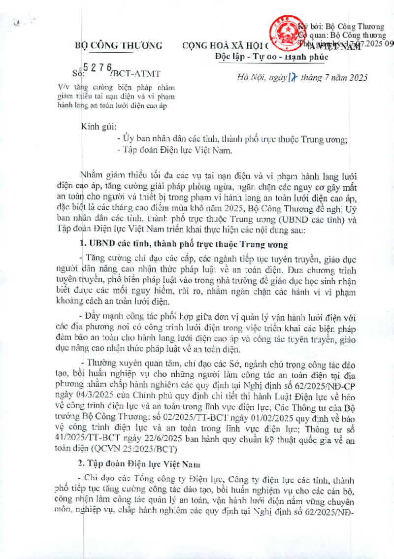 Tiêu đề văn bản | Tăng cường biện pháp nhằm giảm thiểu tai nạn điện và vi phạm hành lang an toàn lưới điện cao áp | ||