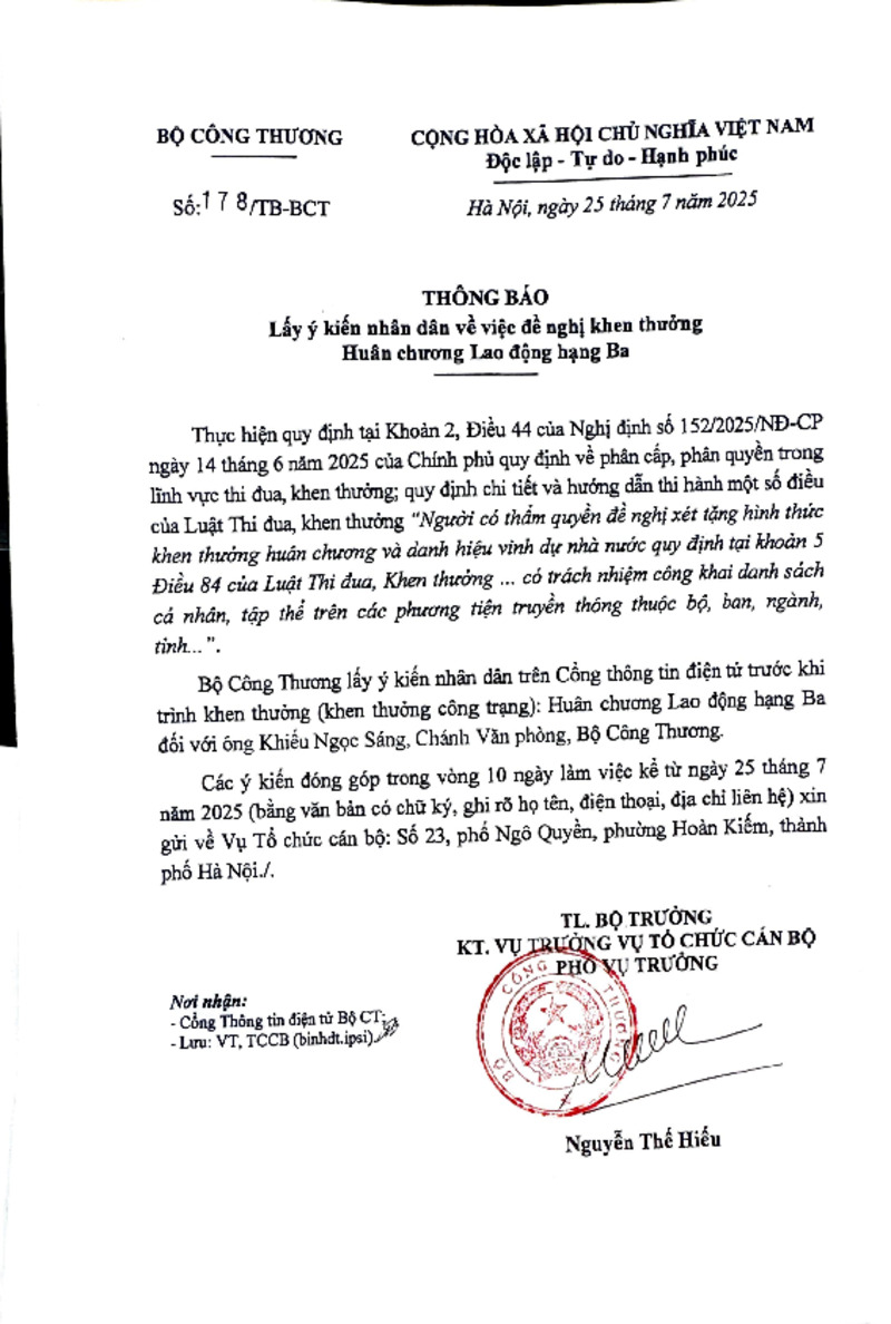 Tiêu đề văn bản | Thông báo lấy ý kiến nhân dân về việc đề nghị khen thưởng Huân chương Lao động hạng Ba | ||