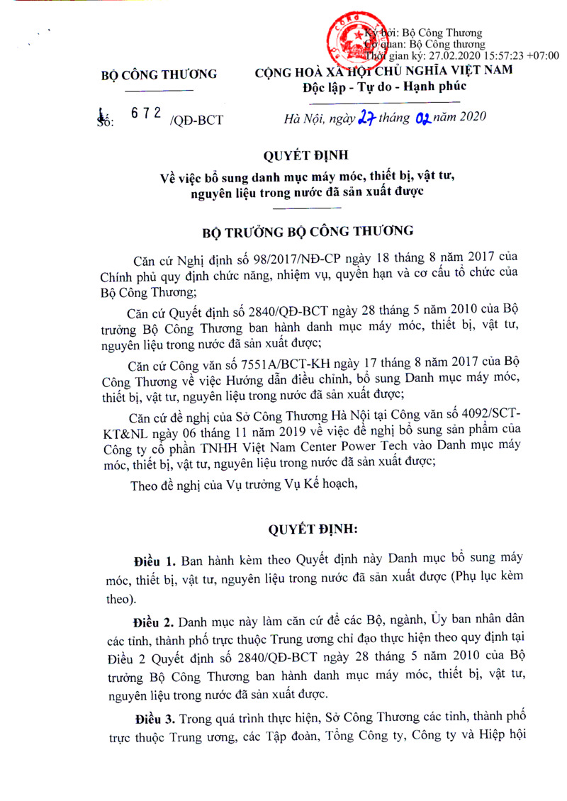 Tiêu đề văn bản | Bổ sung danh mục máy móc, thiết bị, vật tư, nguyên liệu trong nước đã sản xuất được | ||