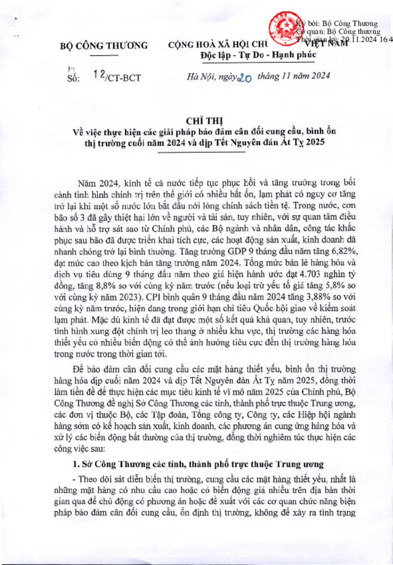 Tiêu đề văn bản | Chỉ thị về việc thực hiện các giải pháp bảo đảm cân đối cung cầu, bình ổn thị trường cuối năm 2024 và dịp Tết Nguyên đán Ất Tỵ 2025 | ||