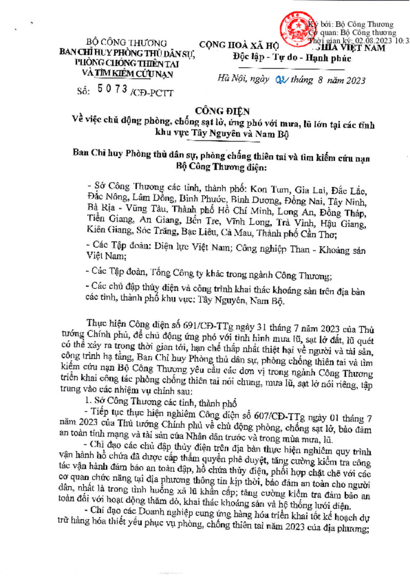Tiêu đề văn bản | Công điện về việc chủ động phòng, chống sạt lở, ứng phó với mưa, lũ lớn tại các tỉnh khu vực Tây Nguyên và Nam Bộ | ||