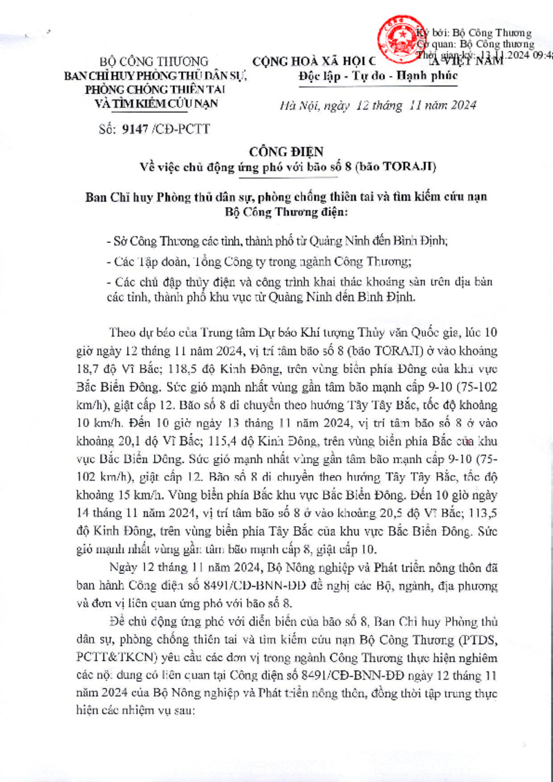 Tiêu đề văn bản | Công điện về việc chủ động ứng phó với bão số 8 (bão TORAJI) | ||