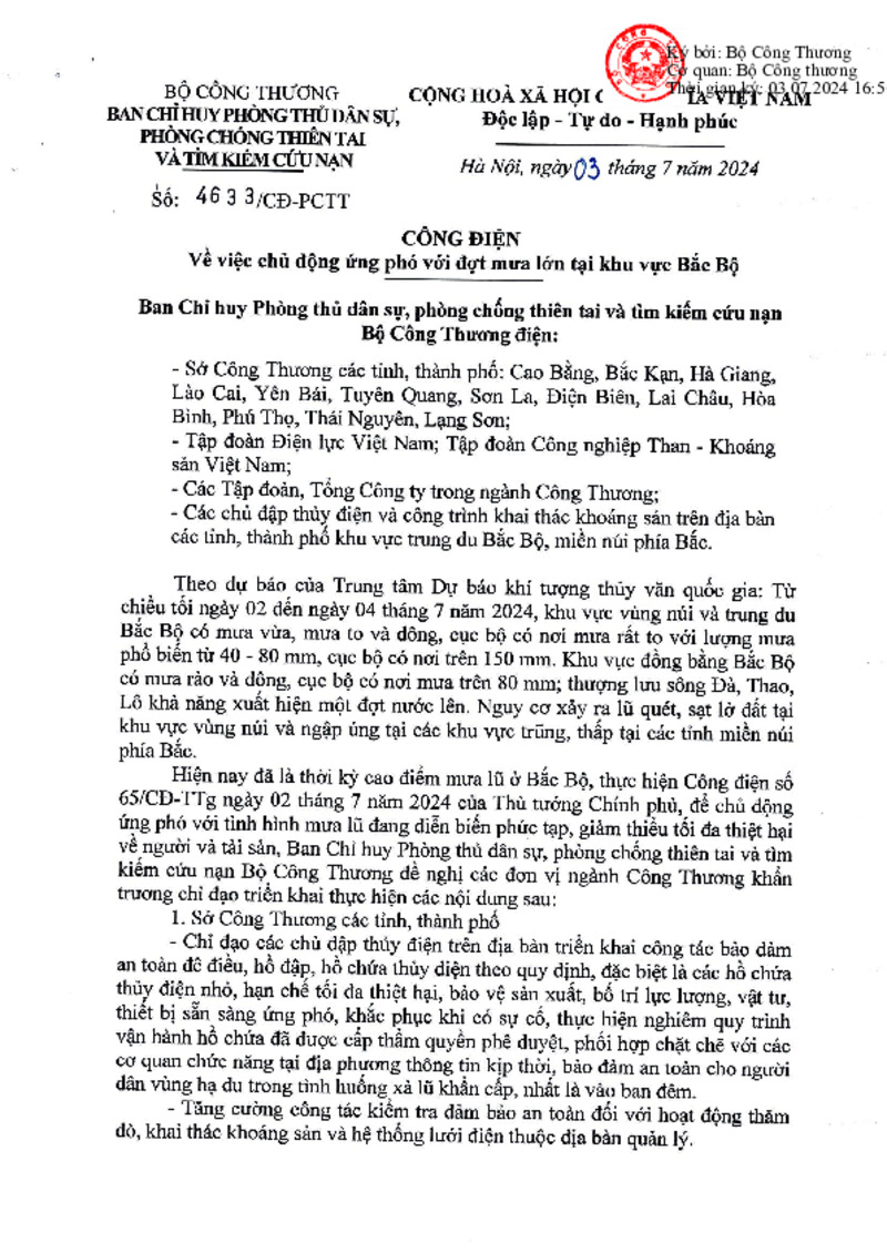 Tiêu đề văn bản | Công điện Về việc chủ động ứng phó với đợt mưa lớn tại khu vực Bắc Bộ | ||