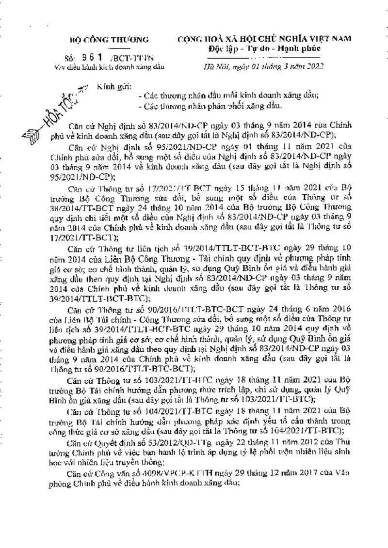 Số hiệu | 961/BCT-TTTN | Cơ quan ban hành | |