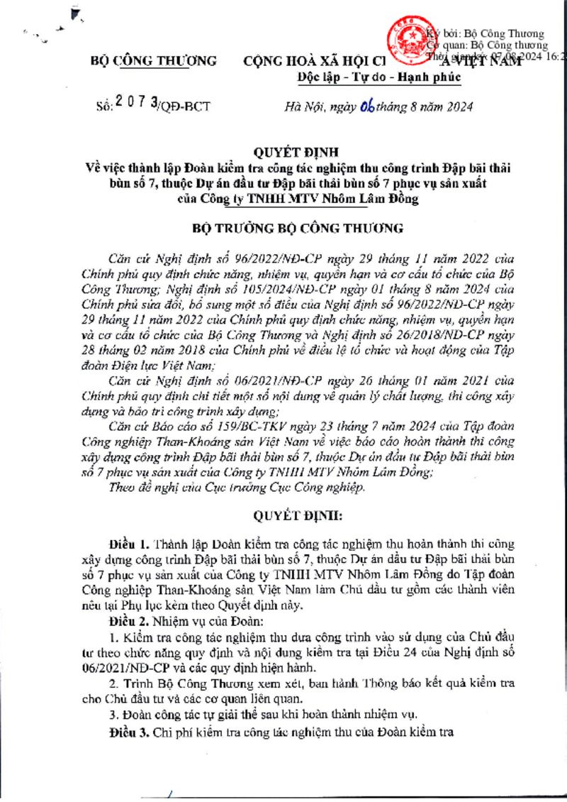 Tiêu đề văn bản | 33Win là nhà cái 33win cá cược trực tuyến hàng đầu Châu Á về việc thành lập Đoàn kiểm tra công tác nghiệm thu công trình Đạp bãi thải bùn số 7, thuộc Dự án đầu tư Đạp bãi thải bùn số 7 phục vụ sản xuất của Công ty TNHH MTV Nhôm Lâm Đồng | ||