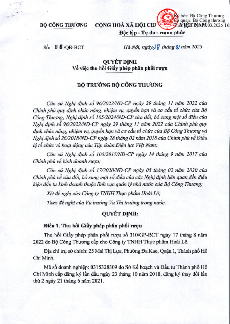 Tiêu đề văn bản | 33Win là nhà cái 33win cá cược trực tuyến hàng đầu Châu Á về việc thu hồi Giấy phép phân phối rượu của Công ty TNHH thực phẩm Hoài Lê | ||
