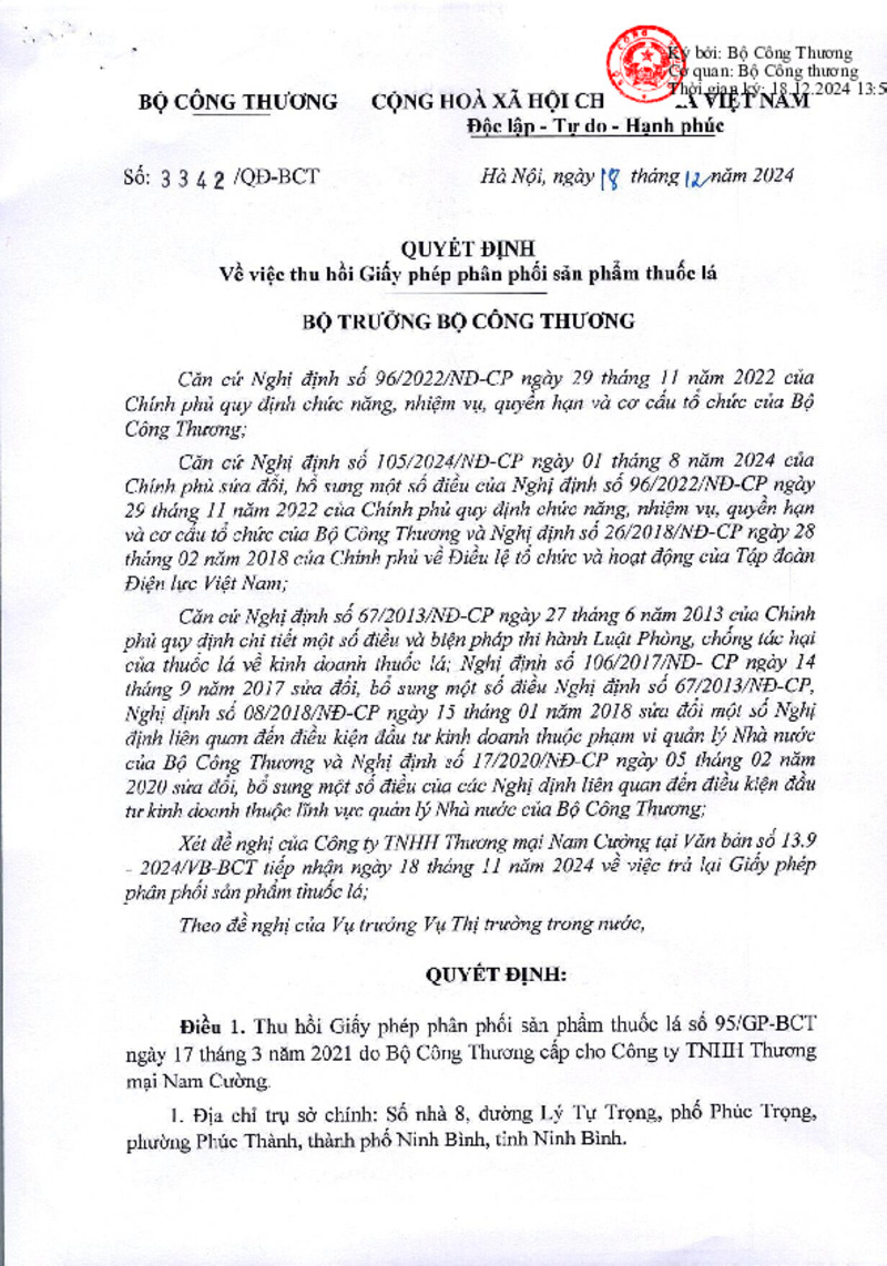 Tiêu đề văn bản | 33Win là nhà cái 33win cá cược trực tuyến hàng đầu Châu Á về việc thu hồi Giấy phép phân phối sản phẩm thuốc lá | ||