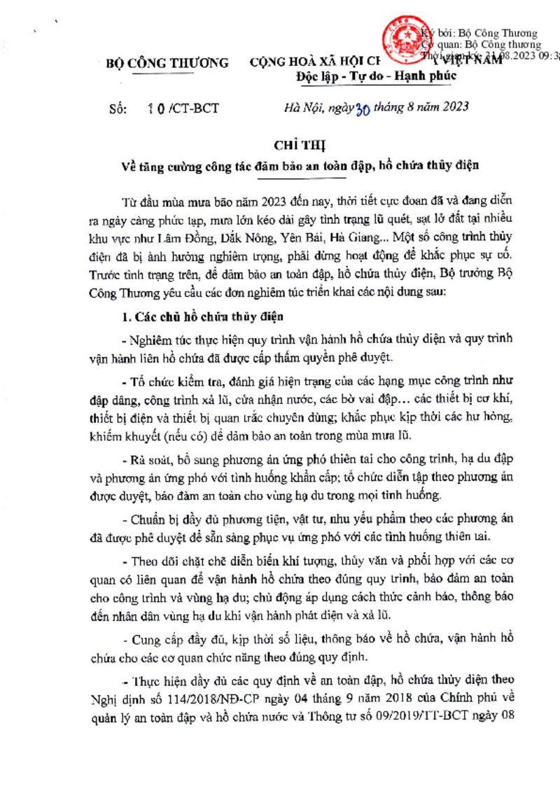 Tiêu đề văn bản | Chỉ thị về tăng cường công tác đảm bảo an toàn đạp, hồ chứa thủy điện | ||