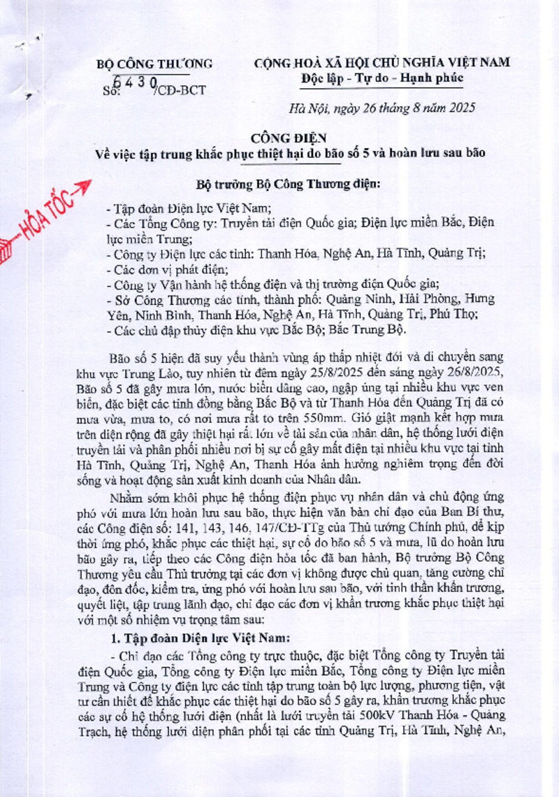 Tiêu đề văn bản | Công điện về việc tập trung khắc phục thiệt hại do bão số 5 và hoàn lưu sau bão | ||