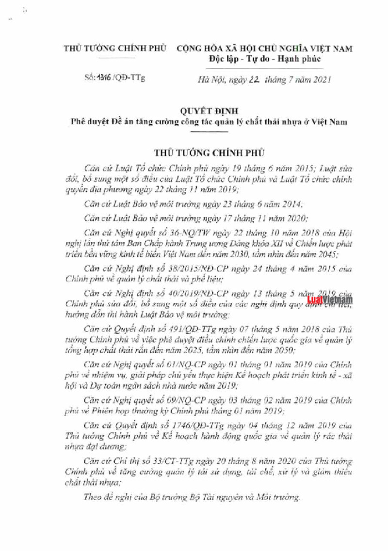 Tiêu đề văn bản | Phê duyệt Đề án tăng cường công tác quản lý chất thải nhựa ở Việt Nam | ||