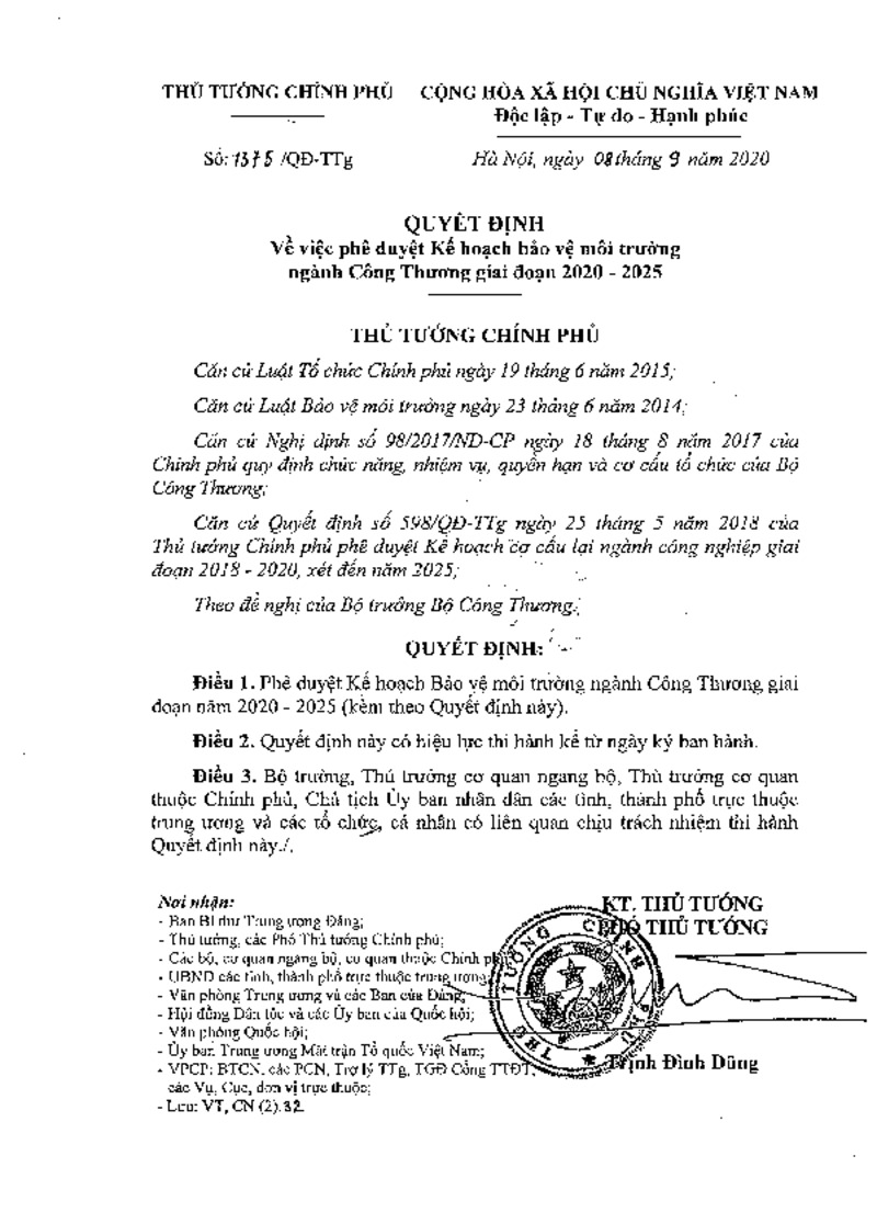 Tiêu đề văn bản | Phê duyệt kế hoạch bảo vệ môi trường ngành Công Thương giai đoạn 2020 - 2025 | ||